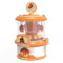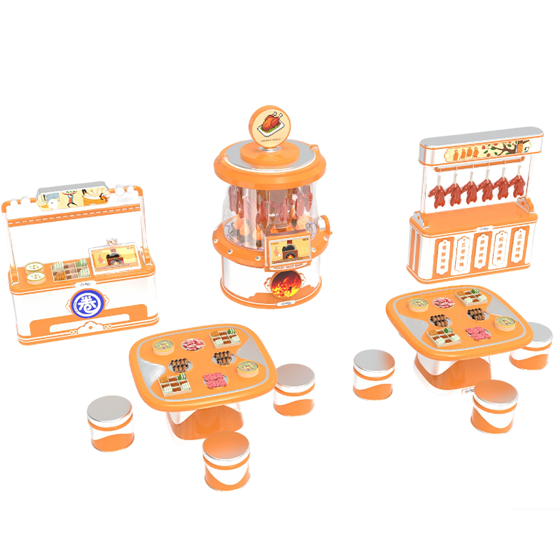 Breaking away from the traditional play kitchen that focuses only on "cooking," it integrates the entire process of "ingredient gathering (fishing/picking)" → "food preparation (AI kitchen)" → "final consumption (revolving restaurant)". The bright warm yellow combined with metallic silver creates a cozy, lively commercial atmosphere.