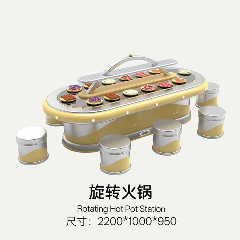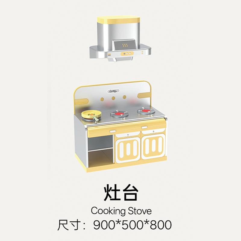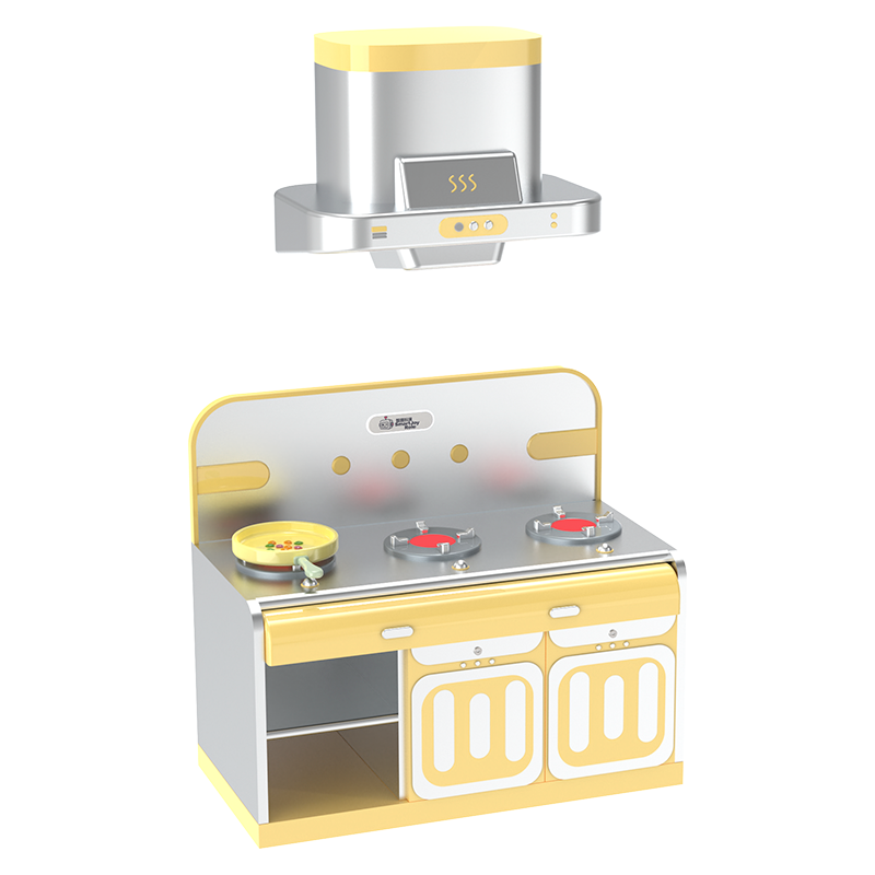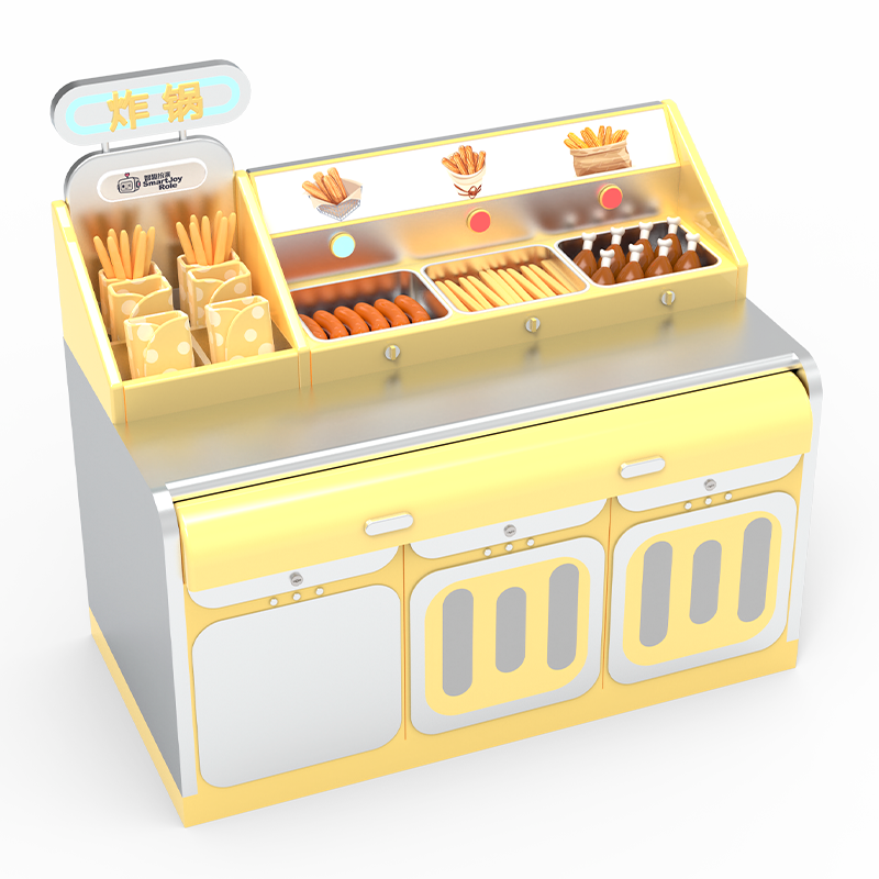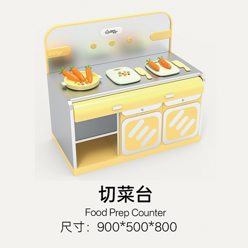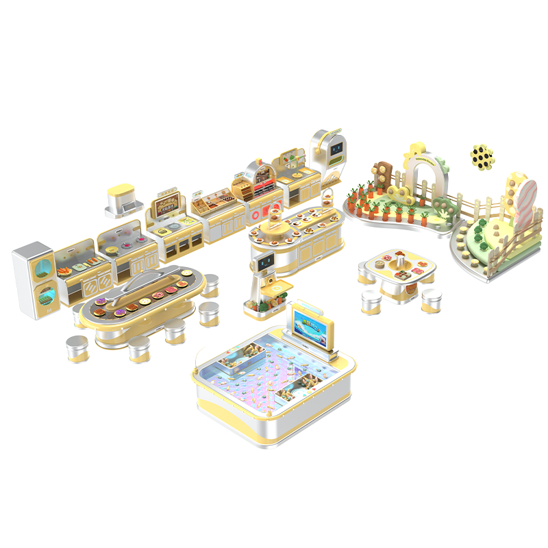 Breaking away from the traditional play kitchen that focuses only on "cooking," it integrates the entire process of "ingredient gathering (fishing/picking)" → "food preparation (AI kitchen)" → "final consumption (revolving restaurant)". The bright warm yellow combined with metallic silver creates a cozy, lively commercial atmosphere.