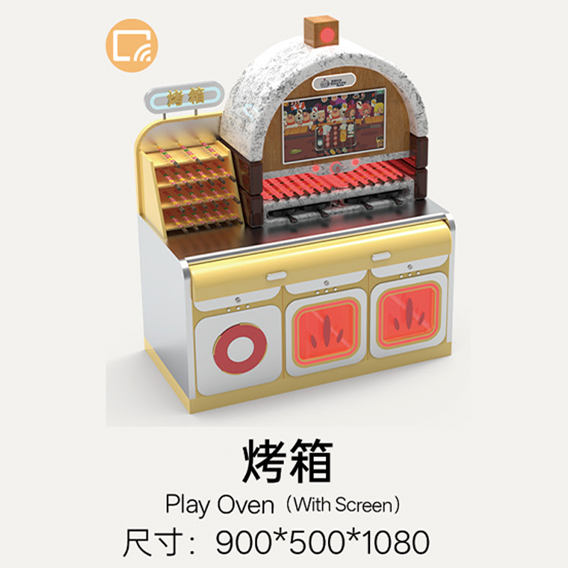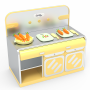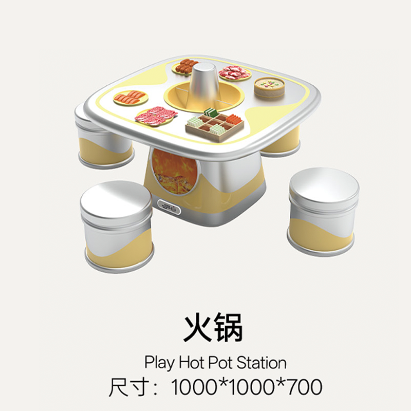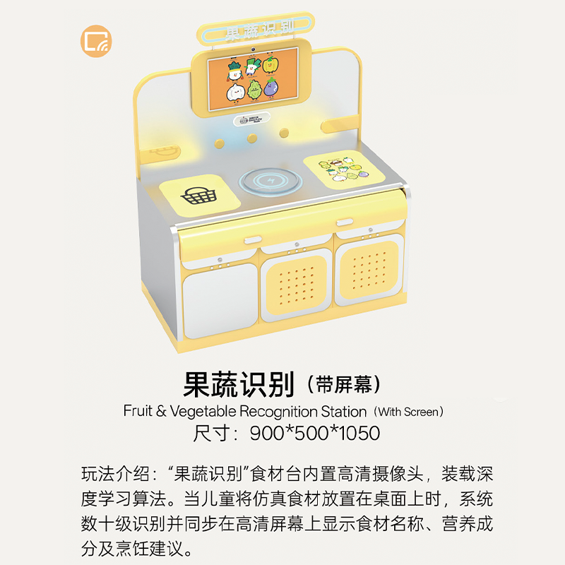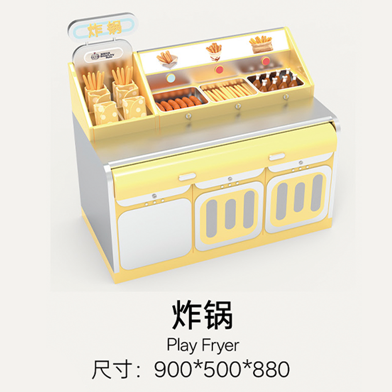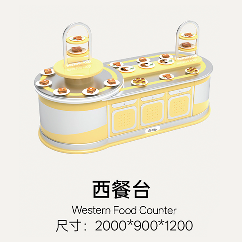 Breaking away from the traditional play kitchen that focuses only on "cooking," it integrates the entire process of "ingredient gathering (fishing/picking)" → "food preparation (AI kitchen)" → "final consumption (revolving restaurant)". The bright warm yellow combined with metallic silver creates a cozy, lively commercial atmosphere.
