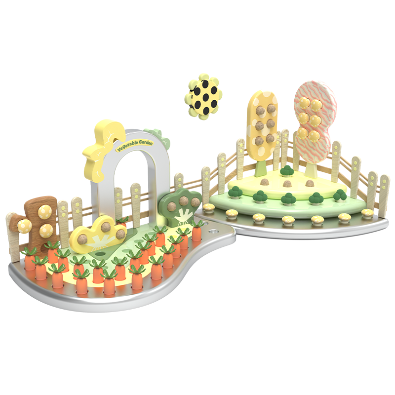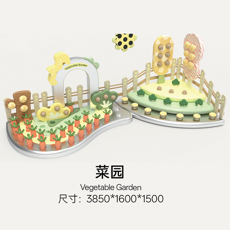 A highly automated, tech‑driven future farming scene. The visual design uses an eco‑green and mechanical orange/tech silver contrast. It combines static role‑playing (vegetable planting area), dynamic motion‑sensing games (horse riding), and mechanical interactions (tractor/cow) for diverse play modes.